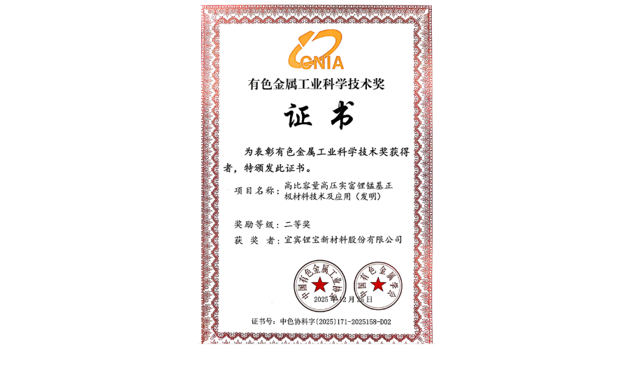 再获殊荣!宜宾锂宝联合研发项目荣获有色金属工业科学技术奖二等奖