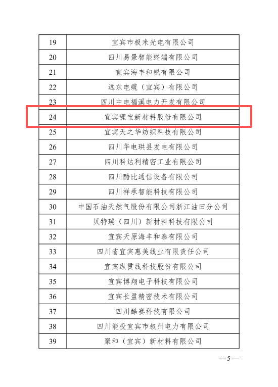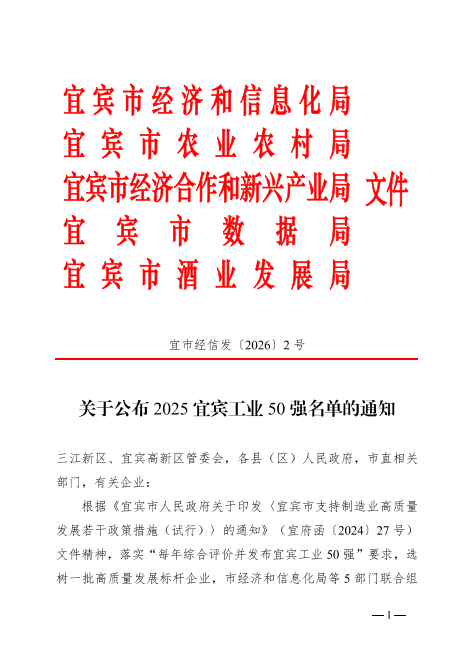 近日,宜宾市经济和信息化局、农业农村局、经济合作和新兴产业局、数据局、酒业发展局联合发布《关于公布2025宜宾工业50强名单的通知》(宜市经信发(2026)2号),宜宾锂宝凭借卓越的综合实力与高质量发展成果,成功入选“2025宜宾工业50强”,彰显了企业在区域经济发展中的标杆地位。